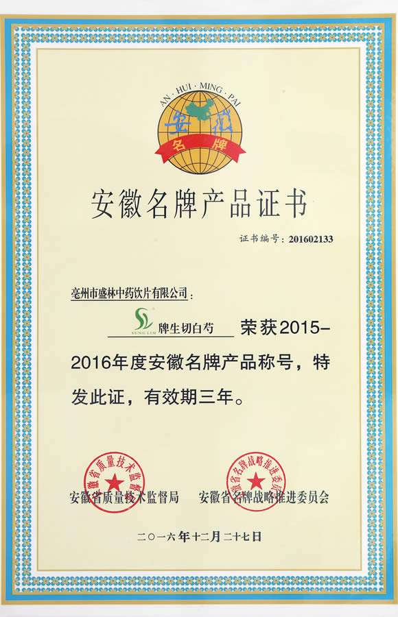 2015-2016年度安徽省名牌产品证书
